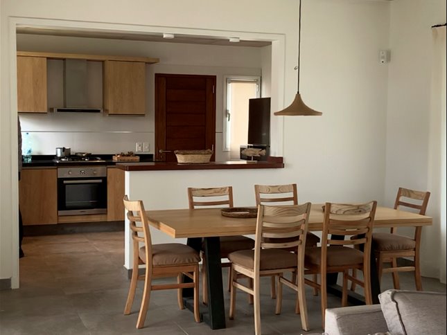 Cocina integrada muy bien equipada, con barra en madera que da al comedor.