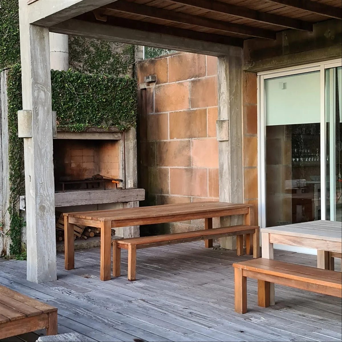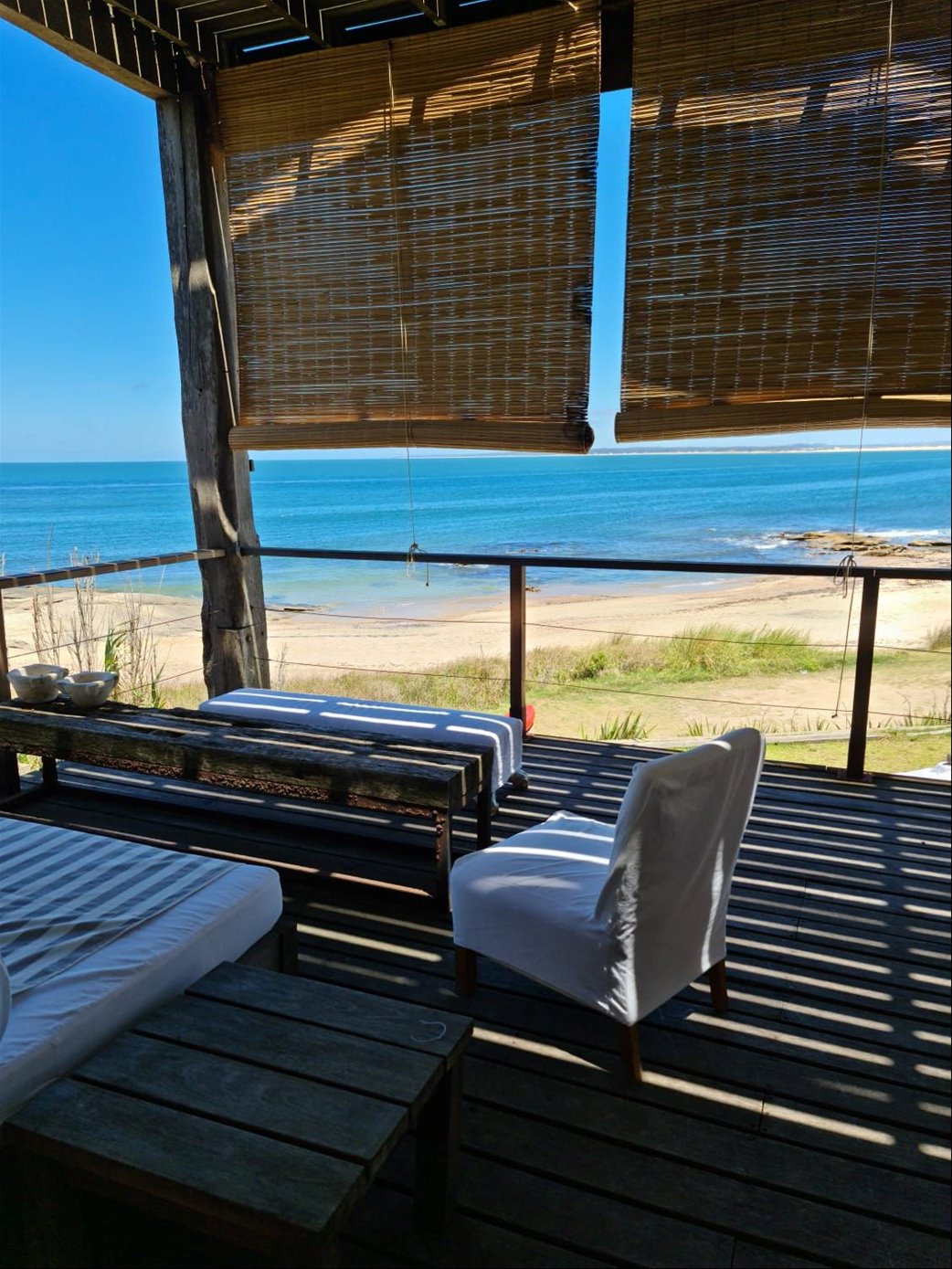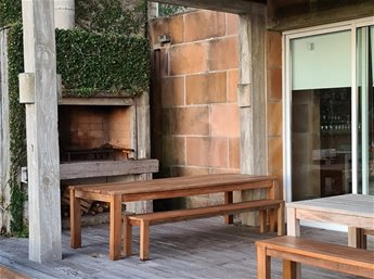 Deck a nivel de la playa con parrillero, 2 mesas de Lapacho, bancos y 2 reposeras dobles. Jardín. Rampa a la playa