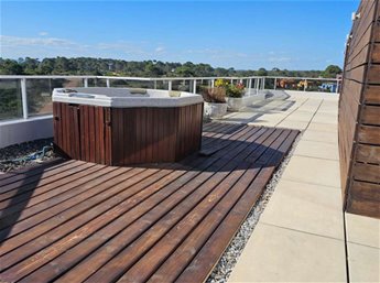 # PISO 5: terraza al mar con jacuzzi, dormitorio en suite con 2 baños independientes, y una barbacoa de enorme tamaño con gran parrillero muebles de excelente nivel empotrados y salida a terraza con jacuzzi .