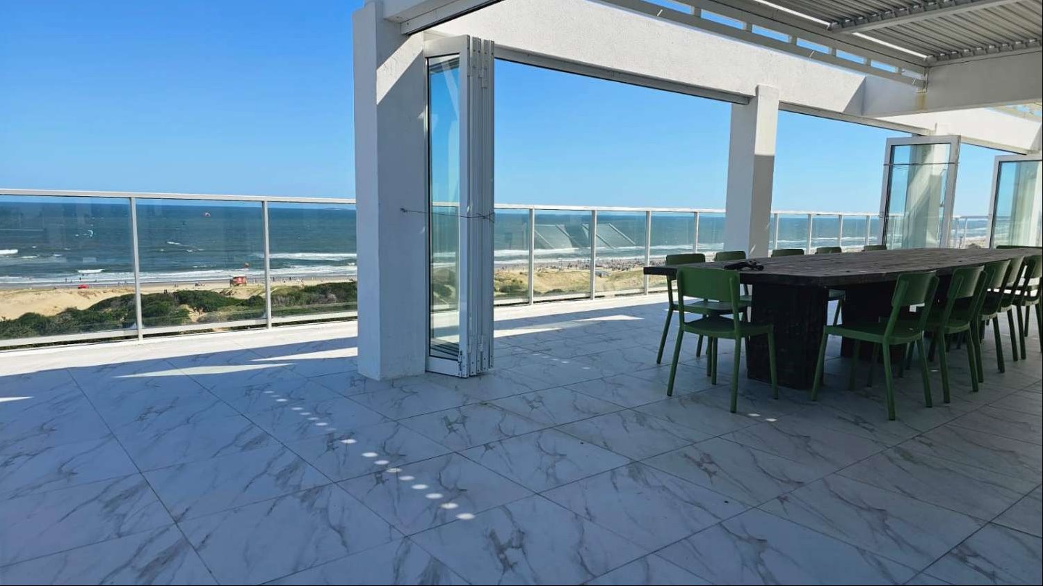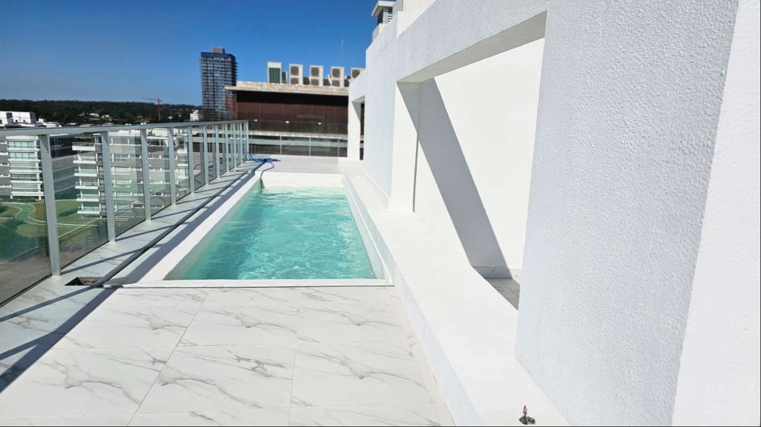 Subimos a la planta alta y nos encontramos con una terraza de ensueño, con barbacoa propia con cerramiento , pergola móvil y piscina propia, una joyita sobre la rambla brava de Punta del Este. En edificio de categoría y privacidad.
